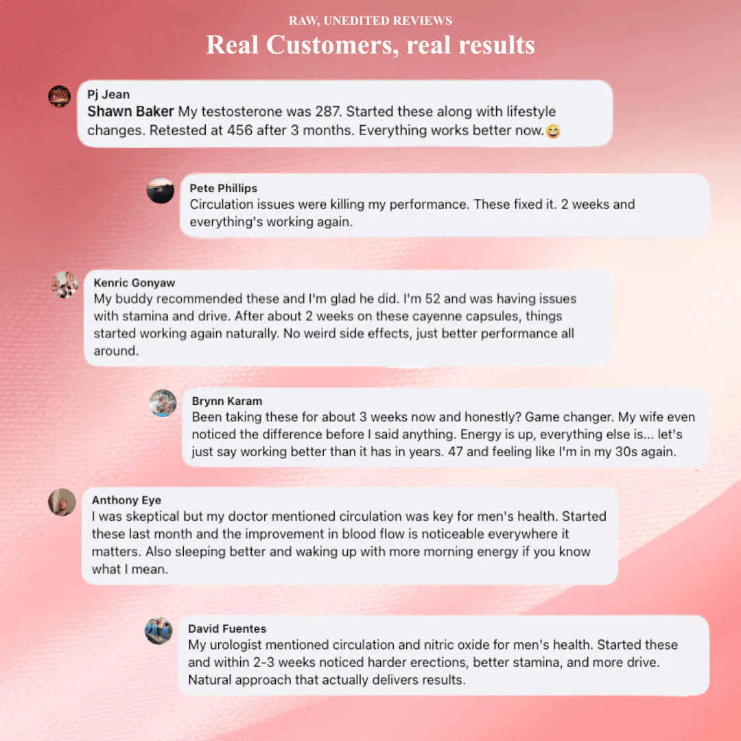 Our premium formula features 300mg of cayenne pepper seed oil combined with 13 additional synergistic botanicals including turmeric, ginseng, berberine, and essential vitamins. This comprehensive blend targets circulation, energy, metabolism, and male vitality—not just one aspect of health.